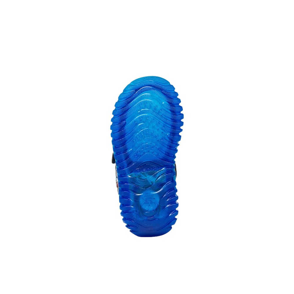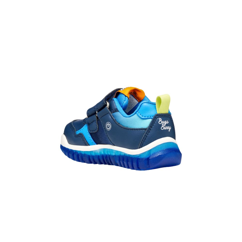 Sneaker baby trendy e sportiva, nata dalla collaborazione tra Geox e Warner Bros. In questa variante che mixa blu navy chiaro e azzurro, Lightyloo presenta grafiche dedicate al personaggio dei Loney Tunes Bugs Bunny e patch con pallina da tennis su uno strap. Realizzata in materiale effetto pelle e tessuto, è dotata di luci integrate nella suola per aumentare il divertimento ad ogni passo.