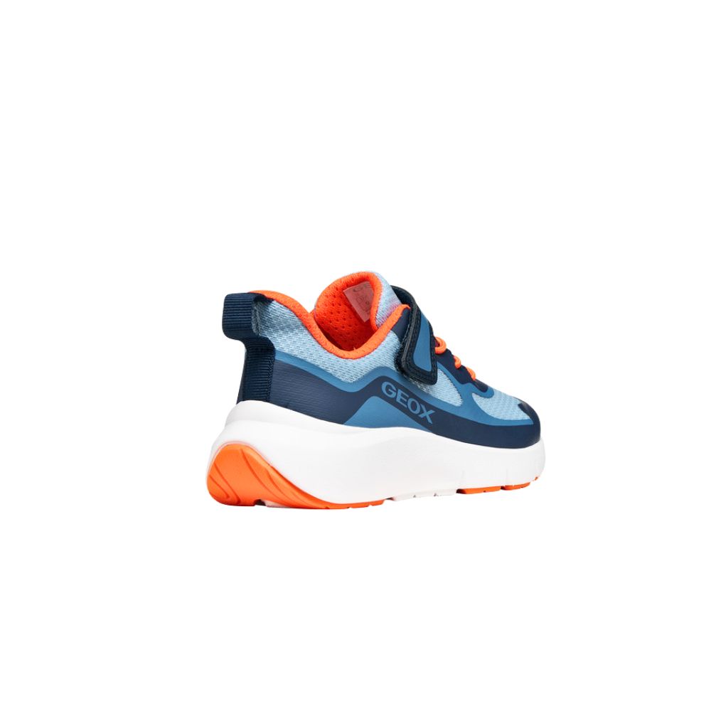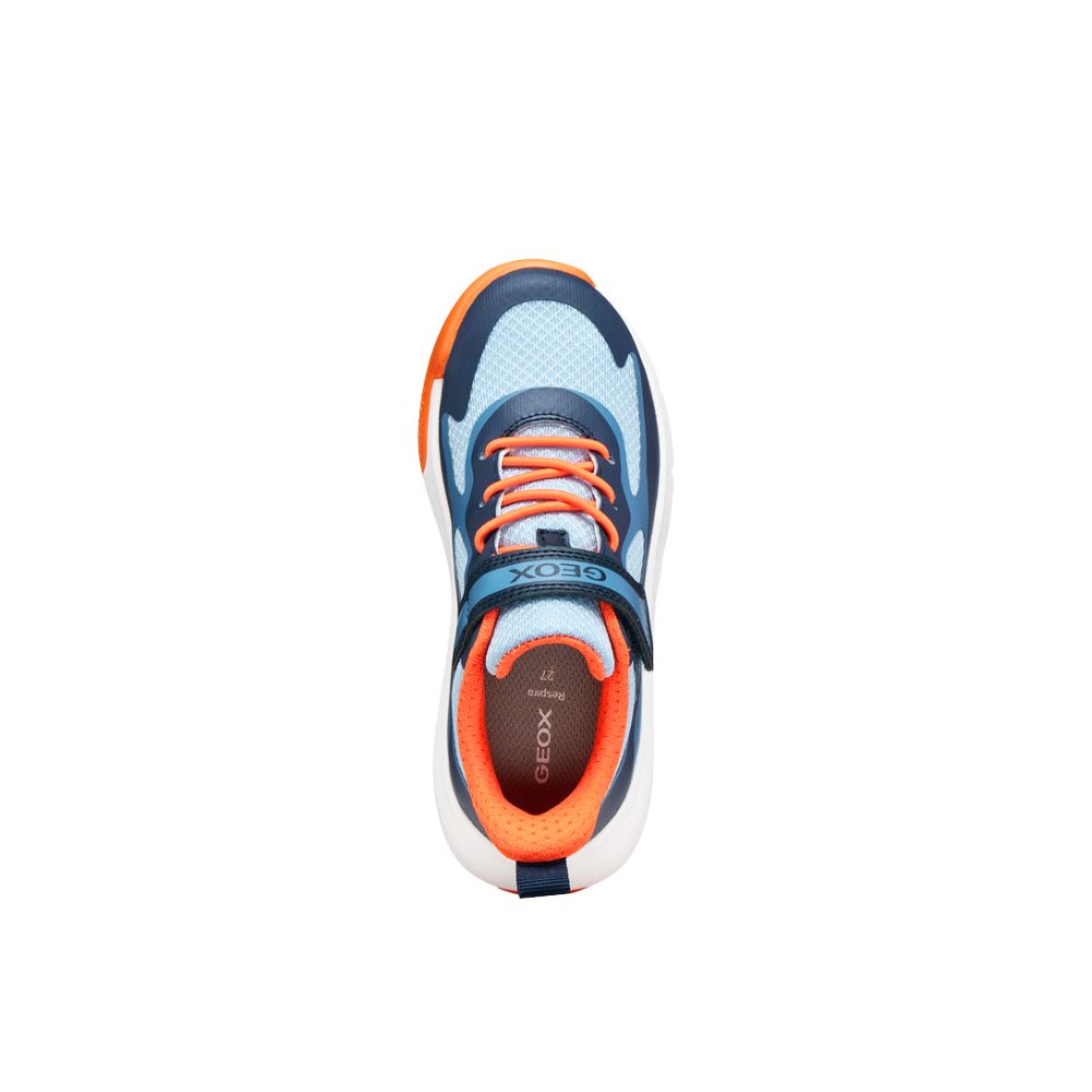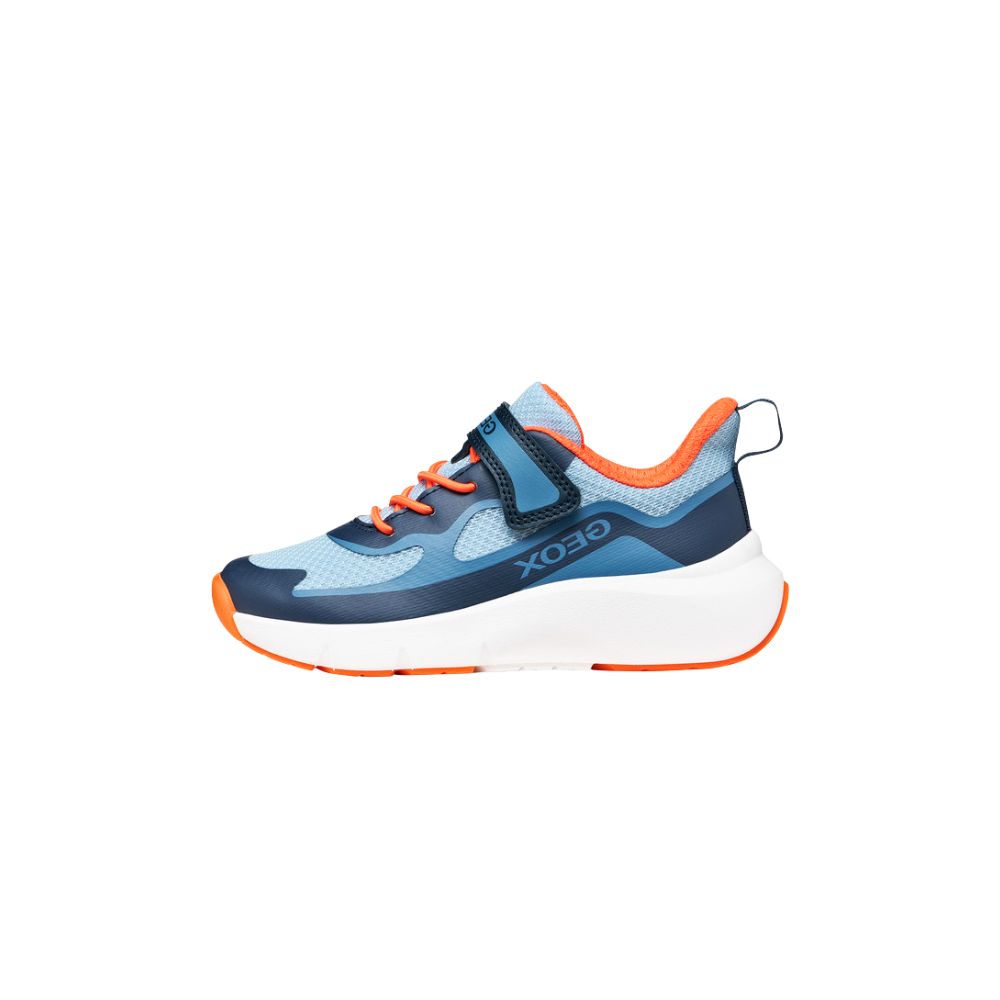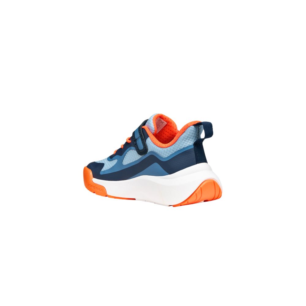 Sneaker junior flessibile e traspirante, progettata per il gioco e accompagnare tutti i loro movimenti. Proposta in blu navy e arancione, è realizzata in mesh e materiale effetto pelle. Pro-Ran coniuga stile e protezione ottimale, grazie a un design dinamico e moderno con punta rinforzata antiurto.