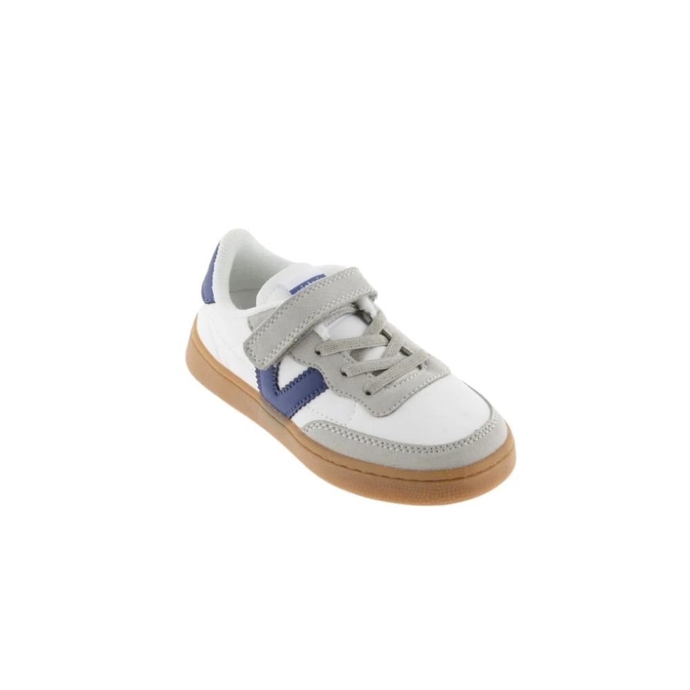 Scarpe sportive per bambini in pelle effetto bianco con inserti in effetto camoscio. Dettaglio di colore nella V laterale di victoria, in coordinato con il retro, che presenta il logo del marchio impresso in bianco. Chiusura con laccio elastico accompagnato da striscia a strappo per facilitare la calzata e garantire sostegno, favorendo l’autonomia. Comoda suola in TPR color caramello.